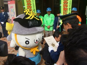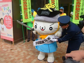 10月1日の「振り込め詐欺の被害防止キャンペーン出発式」に先立ち、かねたんが一ヶ月米沢警察署長の委嘱を受けました。