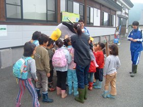 10月5日の田んぼアート稲刈り体験開講式。かねたんが登場すると、あっという間に子ども達が…。
