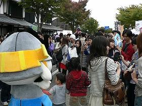 花しょうぶ通り商店街には、歴キャラが集合!おせんちゃんの左が、しまさこにゃん、いしだみつにゃん、おおたににゃんぶ、獣兵衛、