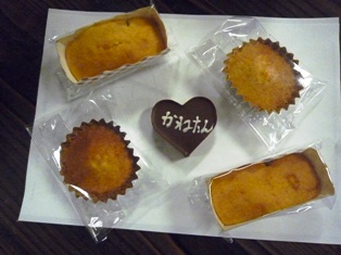 かねたんの名前入りお菓子とけーじろーの顔のケーキです♪