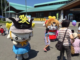 子どもたちに囲まれるかねたんとおせんちゃん(^^♪